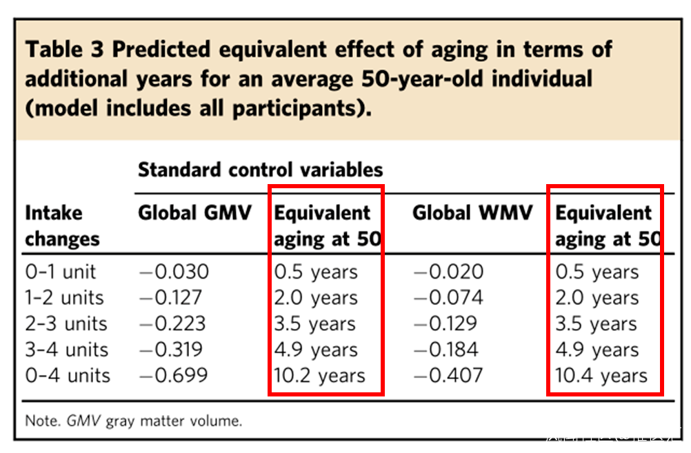 如果將飲酒導致的腦體積減小與衰老引起的腦萎縮作對照,和滴酒不沾的人相比,每天攝入1單位酒精,大腦老化提前了0.5年;而每天攝入4酒精單位的人,大腦老化提前了整整10年。