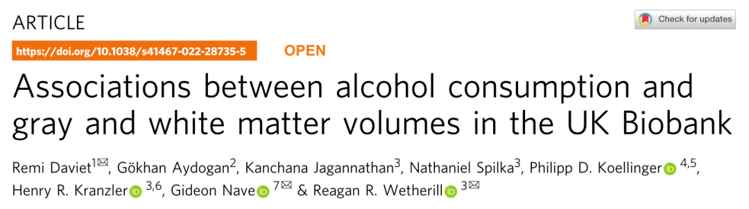 [1] Daviet R, Aydogan G, Jagannathan K, Spilka N, Koellinger PD, Kranzler HR, Nave G, Wetherill RR. Associations between alcohol consumption and gray and white matter volumes in the UK Biobank. Nat Commun. 2022 Mar 4;13(1):1175. doi: 10.1038/s41467-022-28735-5. PMID: 35246521.