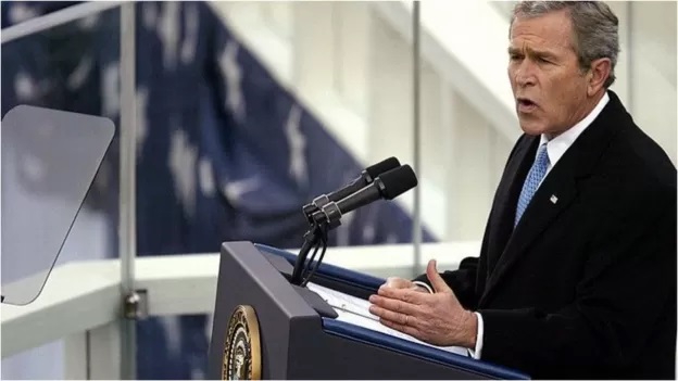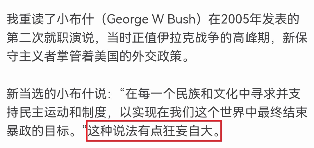 小布什2005年連任時的就職演説裏,提到“在每一個民族和文化中尋求並支持民主運動和制度,以實現在我們這個世界中最終結束暴政的目標”。