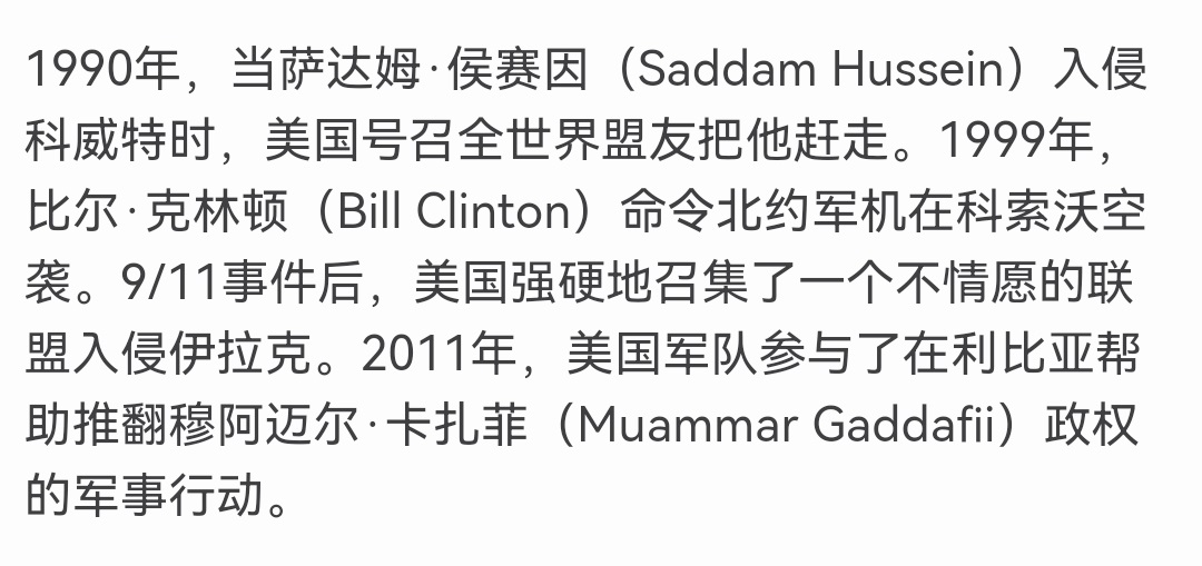 作者簡單地回顧了四個重大歷史事件,與此次俄烏衝突做對比:1990年海灣戰爭、1999年空襲南聯盟、2001年“9·11”恐怖襲擊及此後發生的伊拉克戰爭、2011年利比亞動亂。