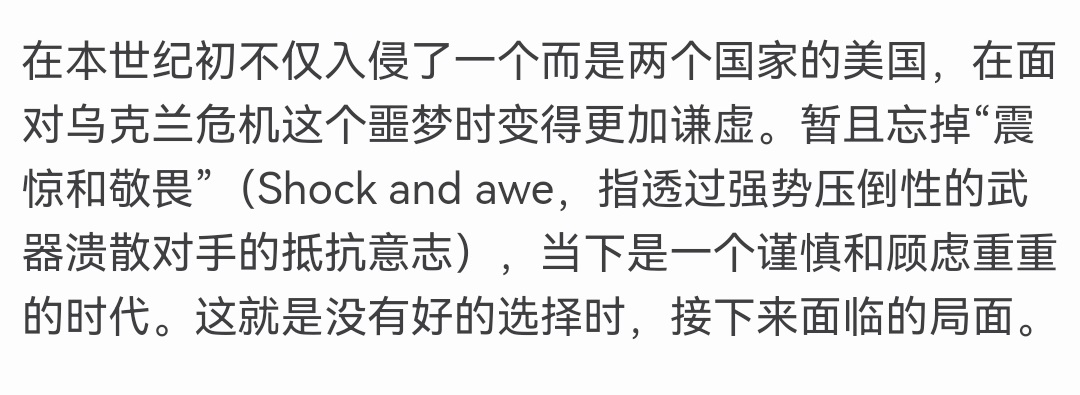 看到這裏,順着作者的邏輯思考下來,我們也只是看到了美國應對俄烏衝突的表現和以往有所不同,何以見得美國“謙遜”了呢?