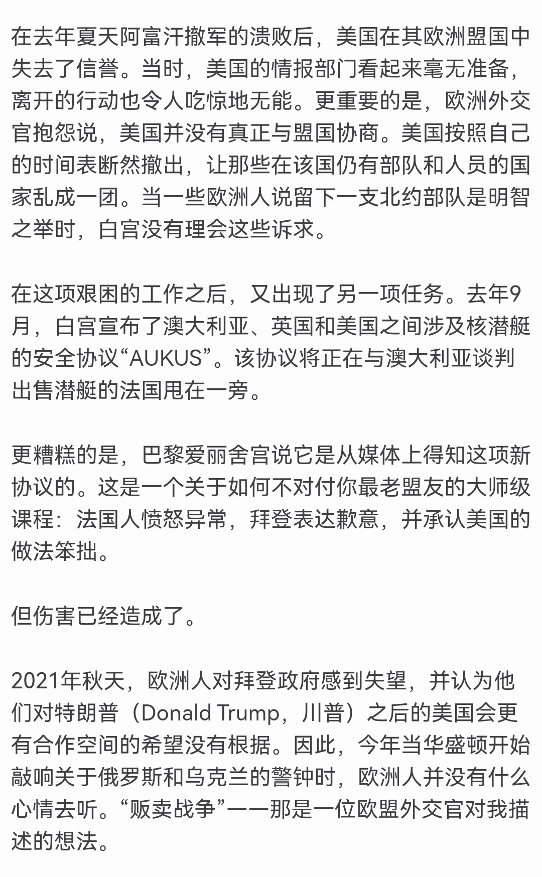 美軍撤離阿富汗時的狼狽、幫助澳大利亞獲得核潛艇背刺法國……美國在其歐洲盟國中失去了信譽,歐洲人對拜登政府感動失望。“狼來了”的故事聽多了以後,“當華盛頓開始敲響關於俄羅斯和烏克蘭的警鐘時,歐洲人並沒有心情去聽”,甚至認為這只是美國人又一次在“販賣戰爭”。