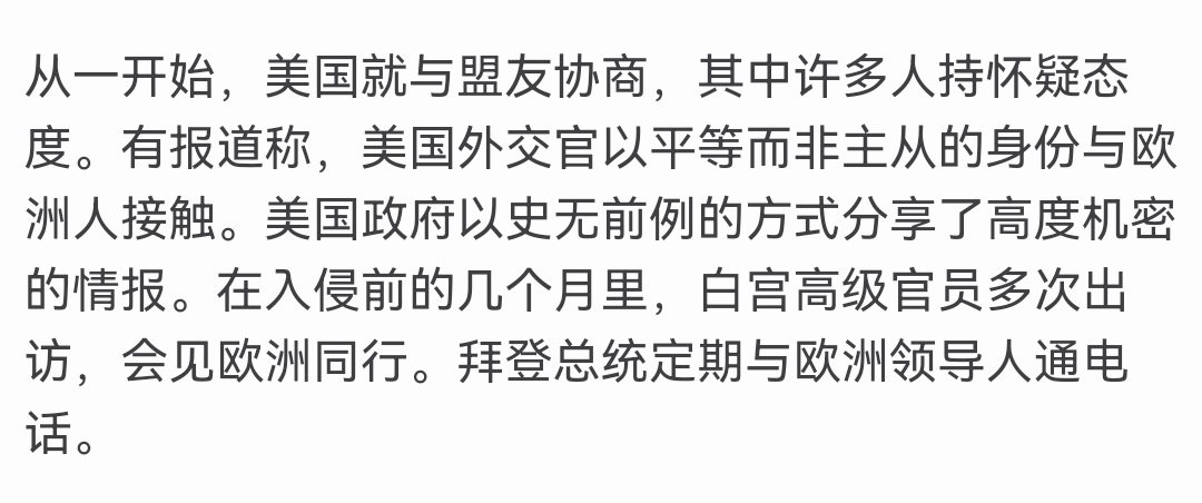 從一開始,美國就與盟友協商……美國外交官以平等而非主從的身份與歐洲人接觸,美國政府以史無前例的方式分享了高度機密的情報。在“入侵”前的幾個月裏,白宮高級官員多次出訪,會見歐洲同行。拜登總統定期與歐洲領導人通電話。