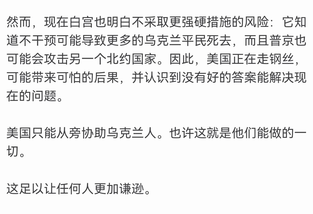 文章一開始,作者便為美國為什麼在此次俄烏衝突中沒有更進一步的動作做辯解,聲稱“美國正在學習謙遜的藝術”,這對世界其他國家來説是一件好事。