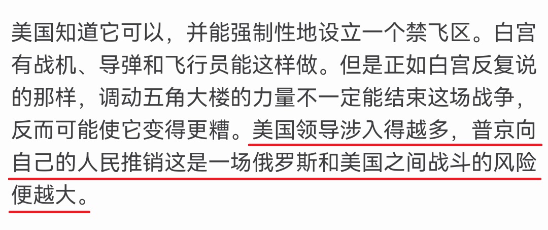 所謂更進一步的動作,指的是美國僅僅提供了軍事援助、情報和網絡支持,而“抵制澤連斯基要求美國出兵的情感懇求”,甚至包括設立禁飛區。作者是這些寫的,“美國知道它可以,並能強制性地設立一個禁飛區。白宮有戰機、導彈和飛行員能這樣做。”
