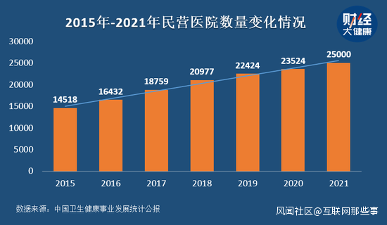 我還發現一個很有趣的現象,對比2015年—2021年《衞生健康事業發展統計公報》中的數據,像愛爾這樣的民營醫院數量從14000多家增長至25000家,六年增長72.19%。但即使是高增長的數據,去民營醫院診療的依舊只佔據16%,是個較低的數字。