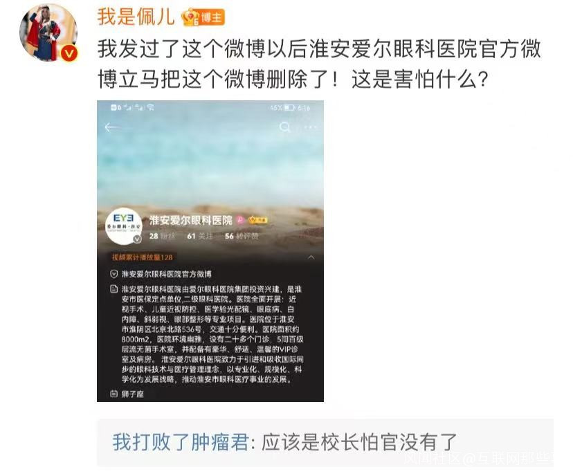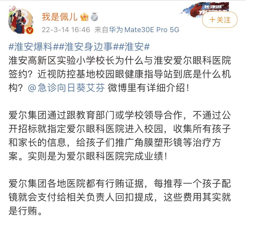 近日與抗疫醫生艾芬關係密切的“我是佩兒”發文稱愛爾集團通過跟教育部門或學校合作,未通過公開招標就指定愛爾眼科醫院進入校園,收集所有孩子和家長的信息,給孩子們推廣角膜塑形鏡等治療方案,實則是為愛爾眼科醫院完成業績。