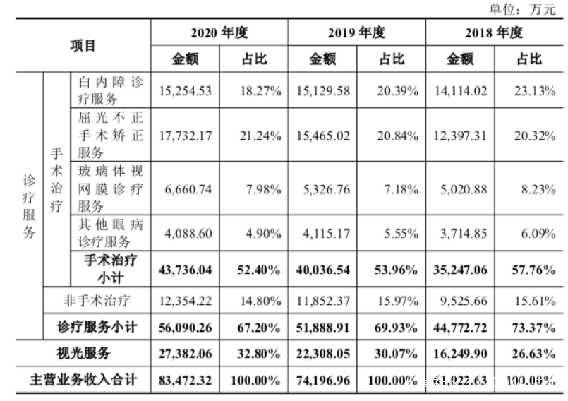 以“遼寧省眼科之王”何氏眼科為例,公司的主營業務——診療服務的收入佔比在逐年減少,從2018年的73.37%到2020年的67.2%;相反,視光服務的營收在增多,從2018年的26.63%到2020年的32.8%。