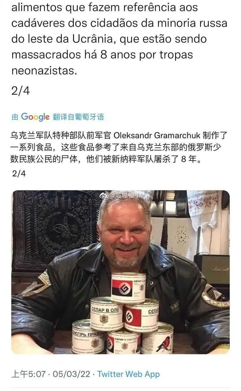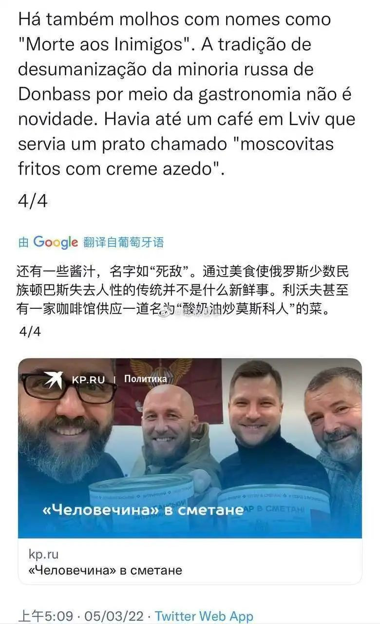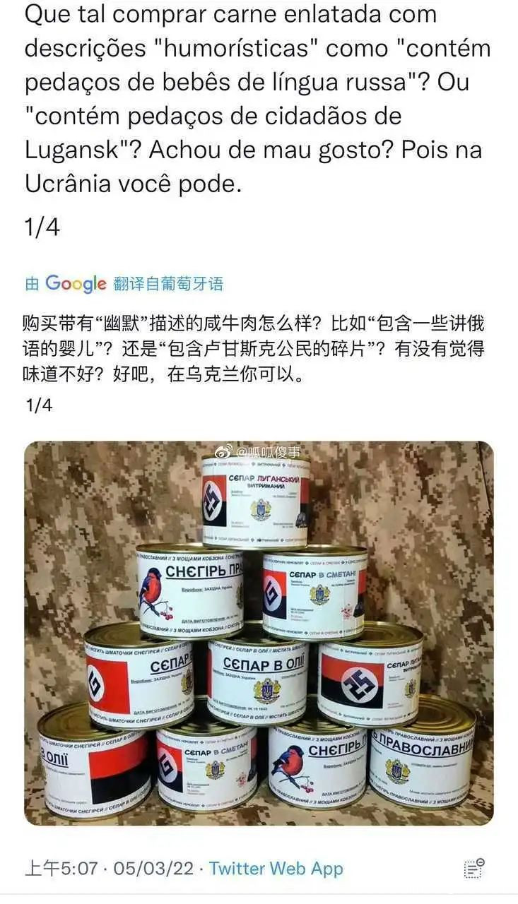 烏克蘭人甚至還搞出了一款包含“講俄語嬰兒碎片”、“盧甘斯克公民碎片”的罐頭,公開售賣,沒有人判他們有罪,也沒有任何媒體批評。