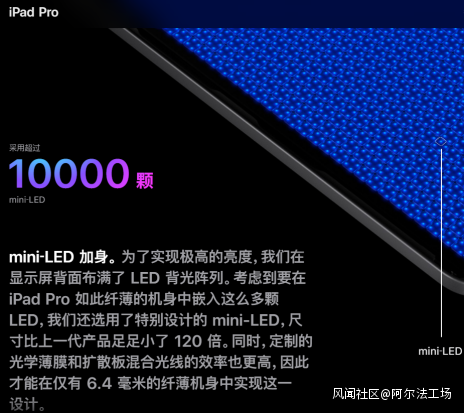 以2021款iPad Pro為例。在12.9英寸的顯示區域內,竟然容納了1萬多顆LED,總計2596個全陣列局部調光區。