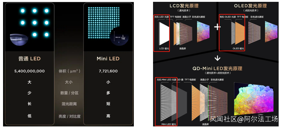 相較於傳統LCD背光源,Mini LED的體積更小,亮度更高;相較於有機發光體的OLED,Mini LED因其採用的是無機材料,不會受到材料活性的干擾,在保證超高亮度的前提下,能避免燒屏、漏光、零部件快速老化等隱患。
