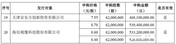 與海信一樣,京東方一出手也是“頂格”申購。兩家同為本次定增申購股份最多的預售對象,“頂格”的6200萬股佔本次實際發行數量的33%。