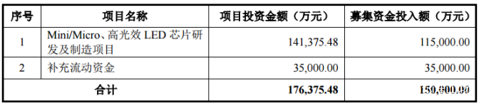 募資主要用於Mini/Micro、高光效LED芯片研發及製造項目及補充流動資金。