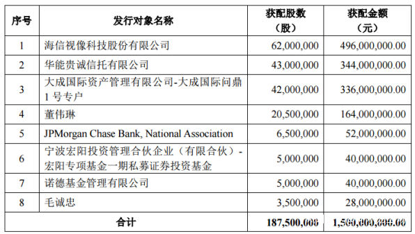 在這8位特定發行對象中,海信視像(600060.SH,以下簡稱海信)傲視羣雄,“頂格”獲配6200萬股,獲配金額達4.96億元,位居定增榜首。