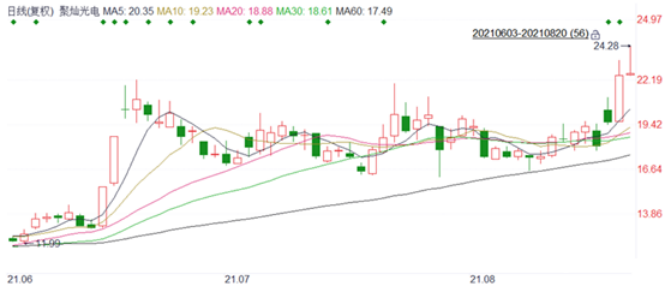 就在2021年6月,聚燦光電(300708.SZ)完成了上市後首次定增募資。7.02億元的募集資金到位後,有效降低了有息負債規模,大幅改善了財務狀況,後續股價從12元附近漲至最高24.28元。
