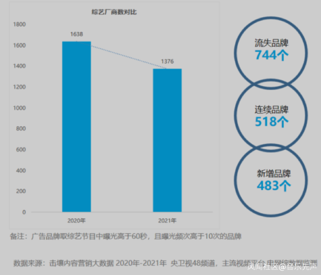尤其是近年來疫情影響下,品牌綜藝合作大幅度減少,節目方更是不敢輕易創新。“擊壤洞察”發佈的《2021綜藝招商白皮書》顯示,2021年有483個新廣告品牌進軍綜藝市場,但退出綜藝投放的品牌達到驚人的744家。這一情況也延續到了今年第一季度的綜藝節目上,各平台“招商項目數”給出的數據同樣讓人堪憂。