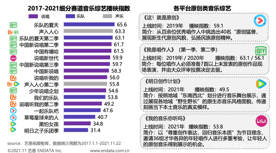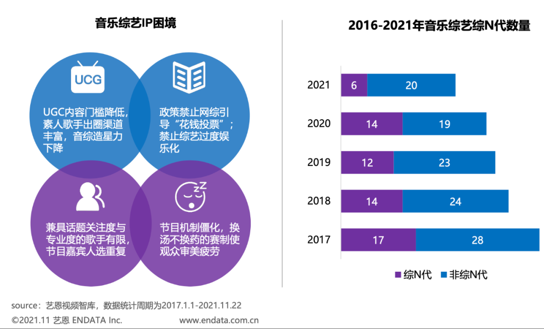 目前,音綜面臨的困境並不比原創音樂更樂觀。音綜一直都是網綜和台綜的大頭類型,但受多重因素影響,《歌手》《樂隊的夏天》等頭部音綜IP均在2021年停做,IP老化、審美疲勞等問題突出。