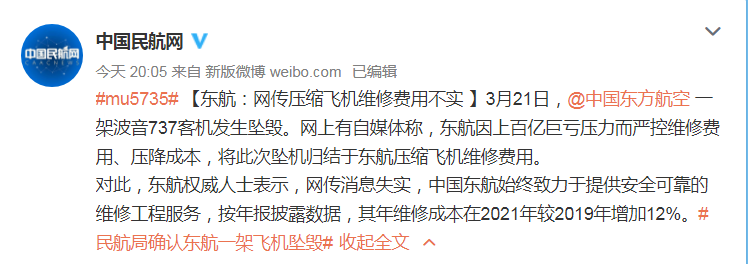 對此,東航權威人士表示,網傳消息失實,中國東航始終致力於提供安全可靠的維修工程服務,按年報披露數據,其年維修成本在2021年較2019年增加12%。
