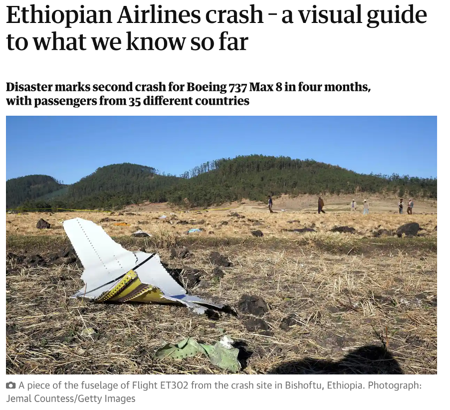 鑑於綠、黃、紅為埃塞俄比亞國旗配色,在谷歌中圍繞關鍵詞“Ethiopian airlines crash”進行搜索,可知2019年3月,埃塞俄比亞航空一架波音737也曾發生重大墜毀事故。據《衞報》報道,當地時間2019年3月11日,埃塞俄比亞航空ET302客機在亞的斯亞貝巴機場附近的比紹圖鎮(Bishoftu)墜毀,機上157人全部遇難。事故發生時,ET302正在執行亞的斯亞貝巴-內羅畢的飛行任務。