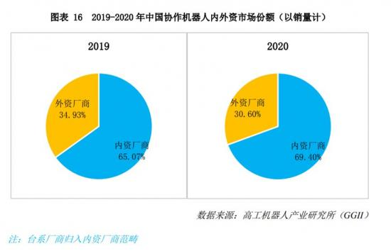 數據顯示,2020年中國協作機器人銷量9900台,同比增長20.73%,遠超全球平均水平。目前,國內協作機器人賽道上已出現2-3傢俱有全球競爭力品牌,節卡就是其中之一,目國內協作機器人市場接近70%份額由本土廠商佔據,打破了外資品牌壟斷性的趨勢。