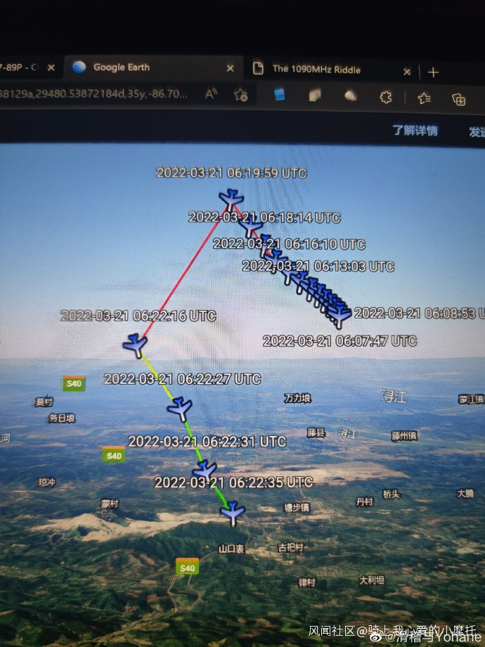 我用微信自帶的拍攝功能拍的圖發在微信一個航空交流的一個羣裏,再被轉到貼吧之後又經歷了無數手之後,我看到的是“為了避開市區努力在爬升和轉向了”。而這與我當時所想表達的不同,我當時只是為了表示飛機軌跡的變化,用FR24導出的數據導入了谷歌地球,很簡單,有手就能做,效果比直接看數據直觀多了。