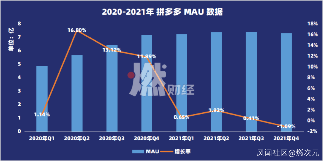 2021年一、二、三、四季度,拼多多月活用户分別為7.25億、7.39億、7.42億以及7.33億,增長十分乏力,第四季度更是環比減少801萬,不敵阿里(單季增長2600萬)、京東(單季增長1750萬)等競爭對手,而與拼多多2020年同期單季增長5710萬的數據相比,更可見明顯疲態。