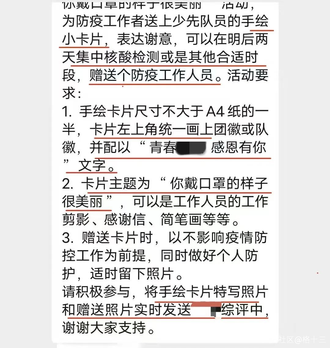 比如有的學校給家長和學生布置的任務是:“在測核酸的時候找個防疫工作人員贈送小卡片併合影拍照”……