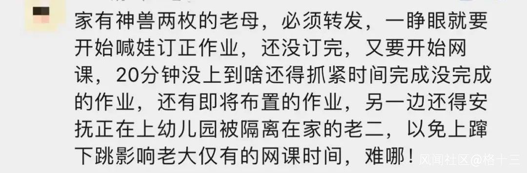 平時孩子正常上學,媽媽們面臨的風險還只是小葉增生啊、卵巢囊腫啥的小問題,網課一來,有些媽媽是第一次直觀感受到了孩子學習時的樣子,大受震撼,於是精神受到了衝擊,崩潰的崩潰,抓狂的抓狂。