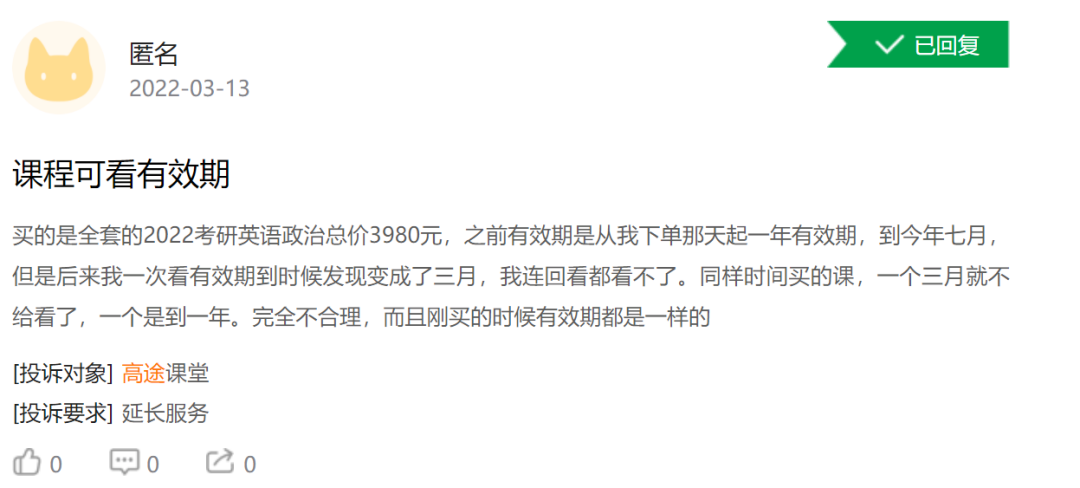 無獨有偶,有學員反映以3980元購買2022考研英語政治全套課程,課程有效期為下單日起一年內有效,但後來查看發現課程有效期變為3個月,到期後無法回看。該學員表示“完全不合理”,要求延長服務。