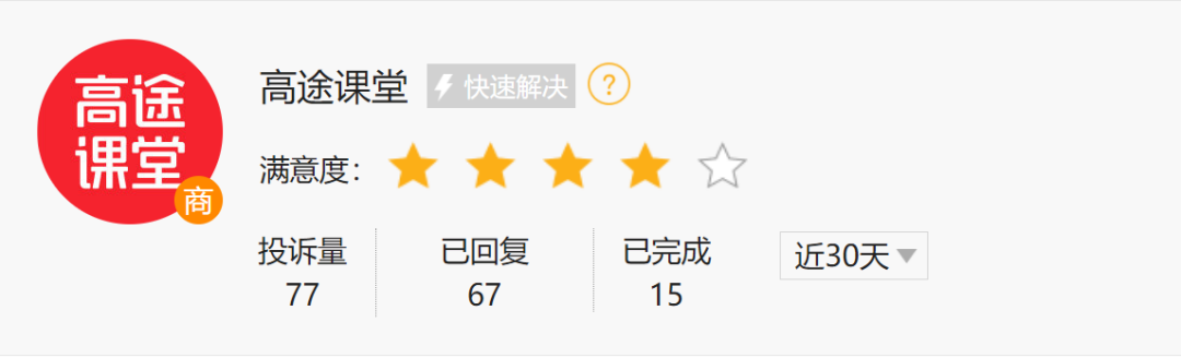 在黑貓投訴平台上,高途課堂近30天內投訴量已達77起。其中,“課程未到有效期就看不了”、“過期後已購買課程也被下架”成為投訴最多的問題。但目前只有15起維權事件顯示已完成。