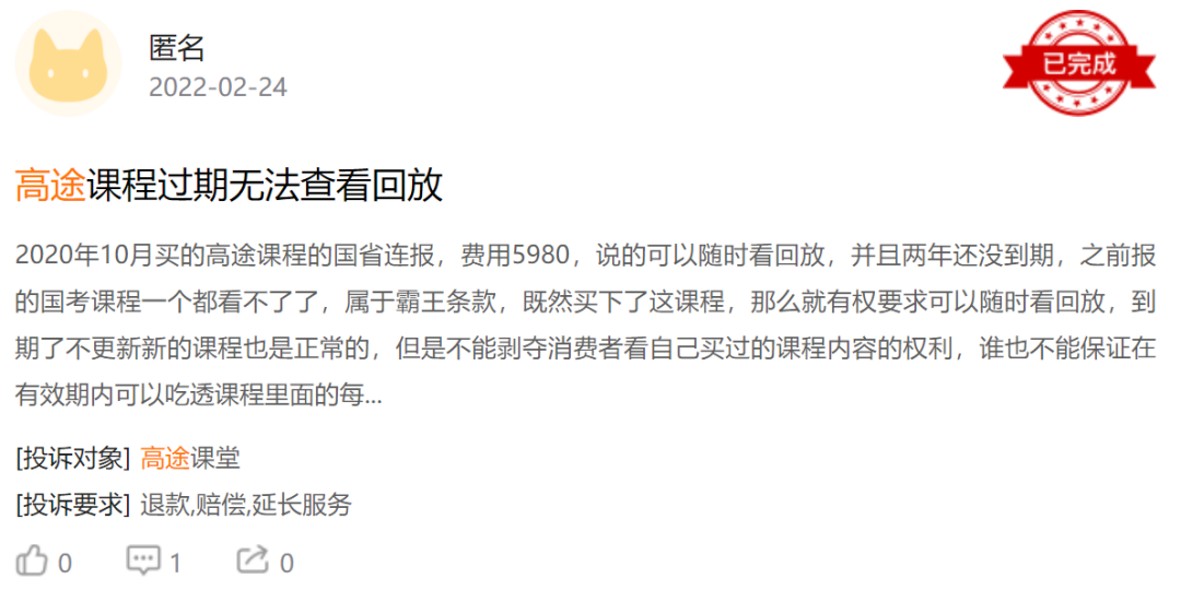 今年2月24日,有消費者在黑貓投訴平台投訴,稱其於2020年10月購買高途國省連報課程,費用為5980元,承諾隨時可以看回放,但還未到期之前報的國考課程一個都看不了了。