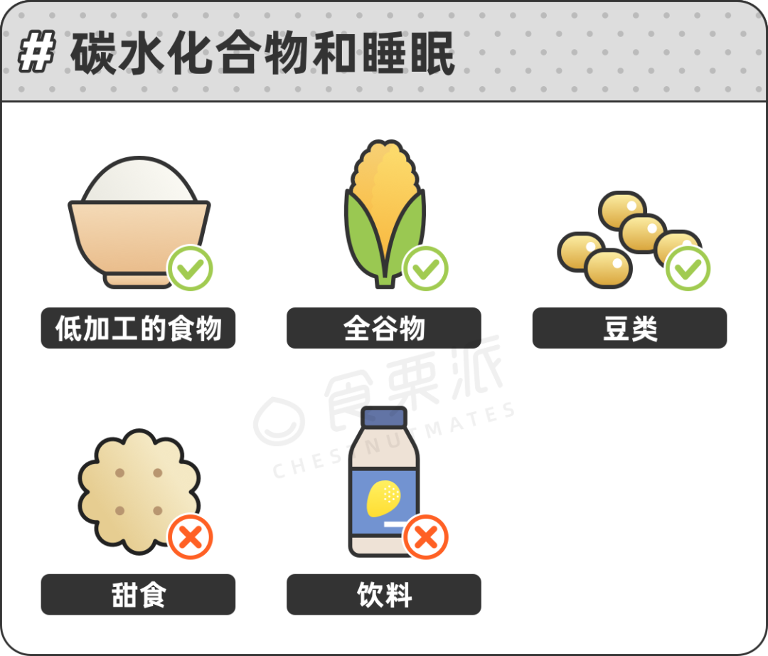看來,碳水化合物的種類和數量,都會影響睡眠。建議選一些低加工的、富含膳食纖維的食物。