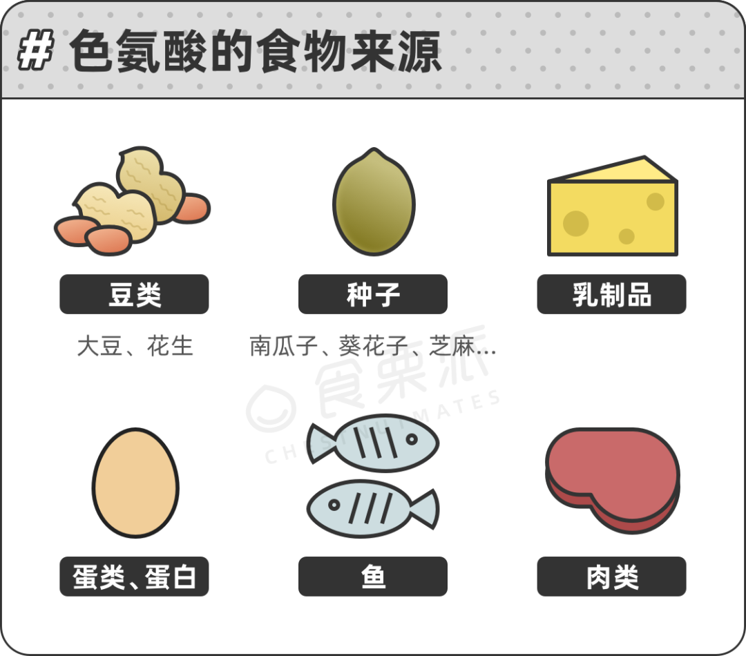 含大量色氨酸的食物包括:肉類和魚、蛋類(蛋白)、乳製品、豆類、種子等。