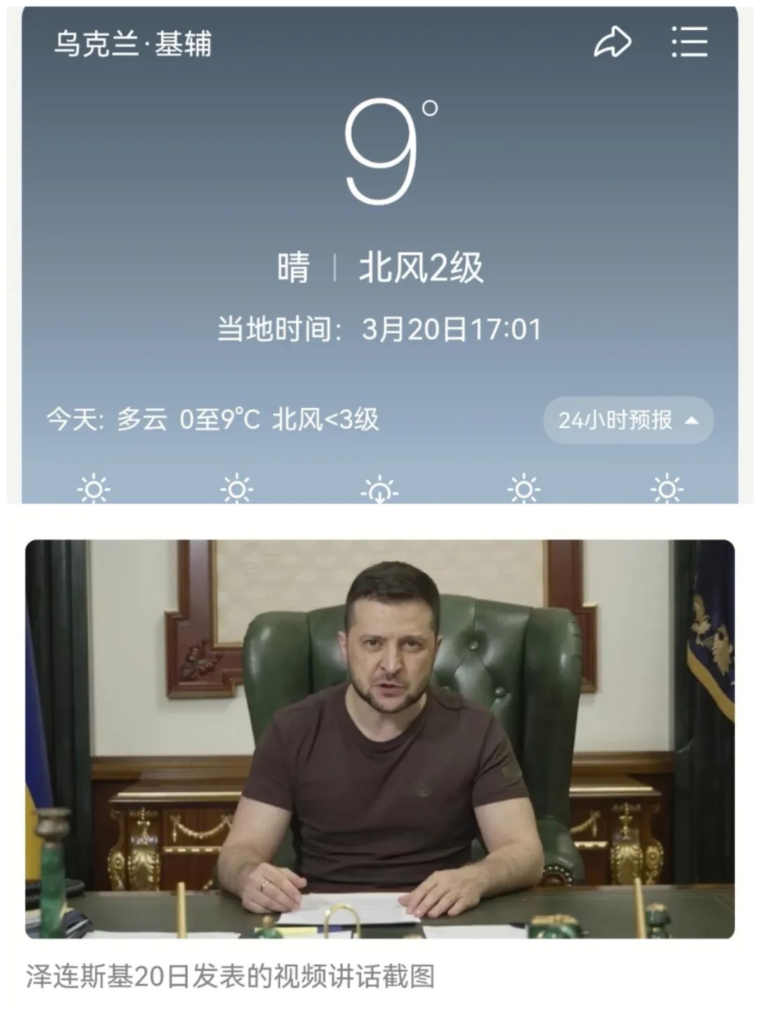 澤連斯基一直説自己在基輔堅持戰鬥,20日基輔氣温0—9攝氏度。這是穿短袖的季節嗎?