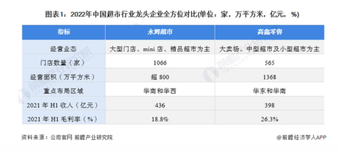另外,據前瞻經濟學人統計,永輝超市包括大型門店、mini店共有1066家門店,總經營面積超800萬平方米;高鑫零售共有565家門店,總經營面積為1368萬平方米。