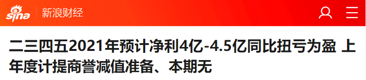 新浪財經——二三四五2021年預計淨利4億-4.5億同比扭虧為盈 上年度計提商譽減值準備、本期無