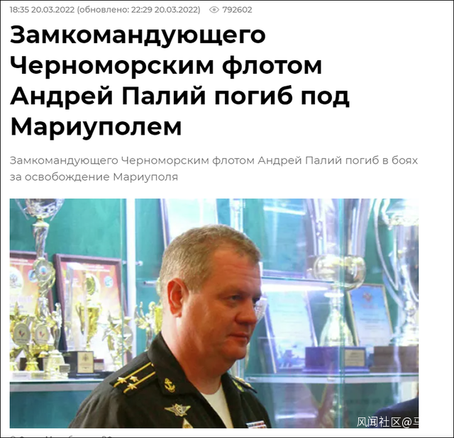 俄羅斯聯邦委員一名議員和塞瓦斯托波爾市市長20日説,俄黑海艦隊副司令安德烈·尼古拉耶維奇·帕利在馬裏烏波爾的作戰中陣亡。