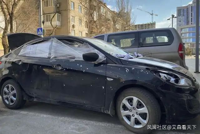 3月17日,一輛被炮擊毀壞的汽車停在烏克蘭,這輛汽車被美聯社記者用來逃離馬裏烏波爾的封鎖線。