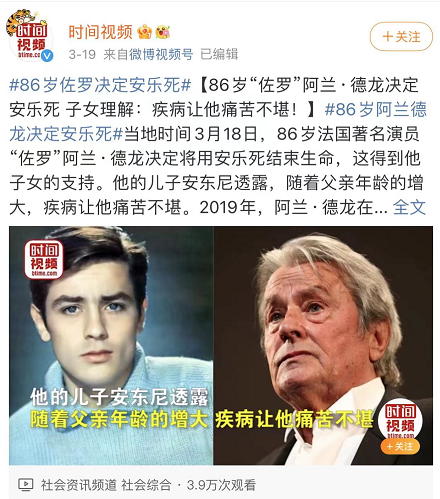 3月18日,已經86歲的電影巨星阿蘭·德龍向外界確認,因難以忍受心臟和中風等疾病折磨,他決定在瑞士接受安樂死,而他的家人也表示尊重老爺子的這一決定。