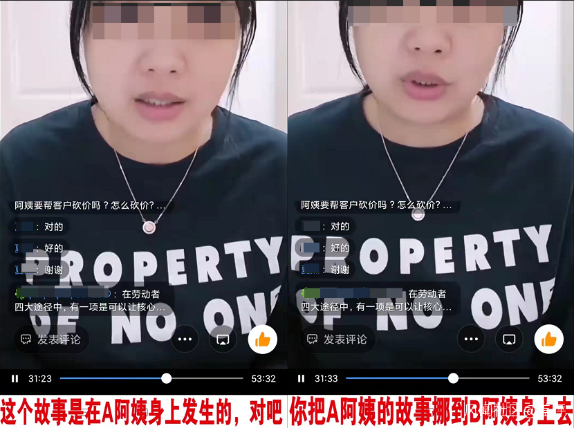在一則泄露的天鵝到家內部培訓直播中,培訓老師就曾教過後台服務員工,如何把阿姨 A 的經歷,套到 B 阿姨的身上。