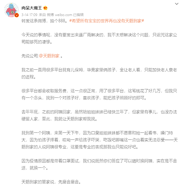 而天鵝到家算是個比較大的平台,工作人員又説他們有 “ 專業月嫂,不滿意隨時換 ”,於是肉呆便付給天鵝到家一筆服務費,讓其幫忙找找合適的人選。