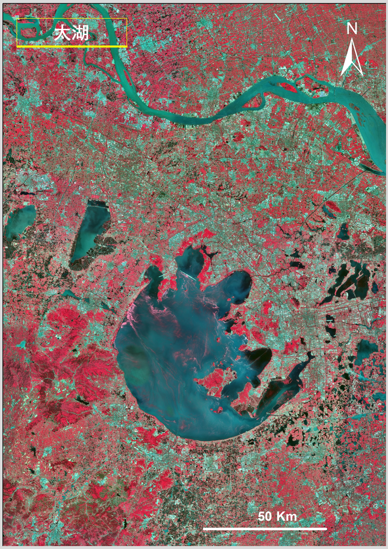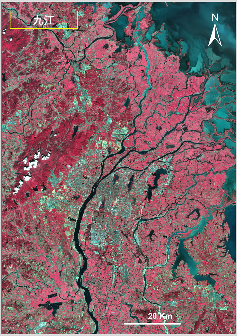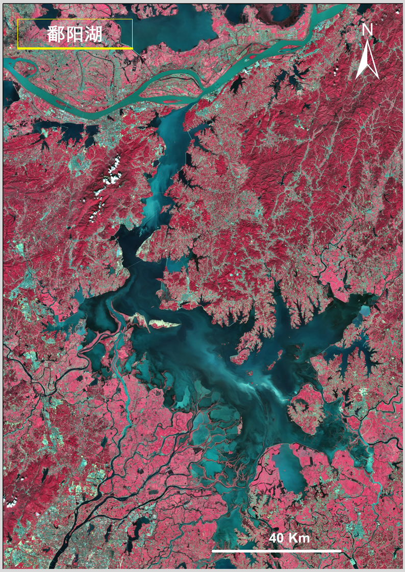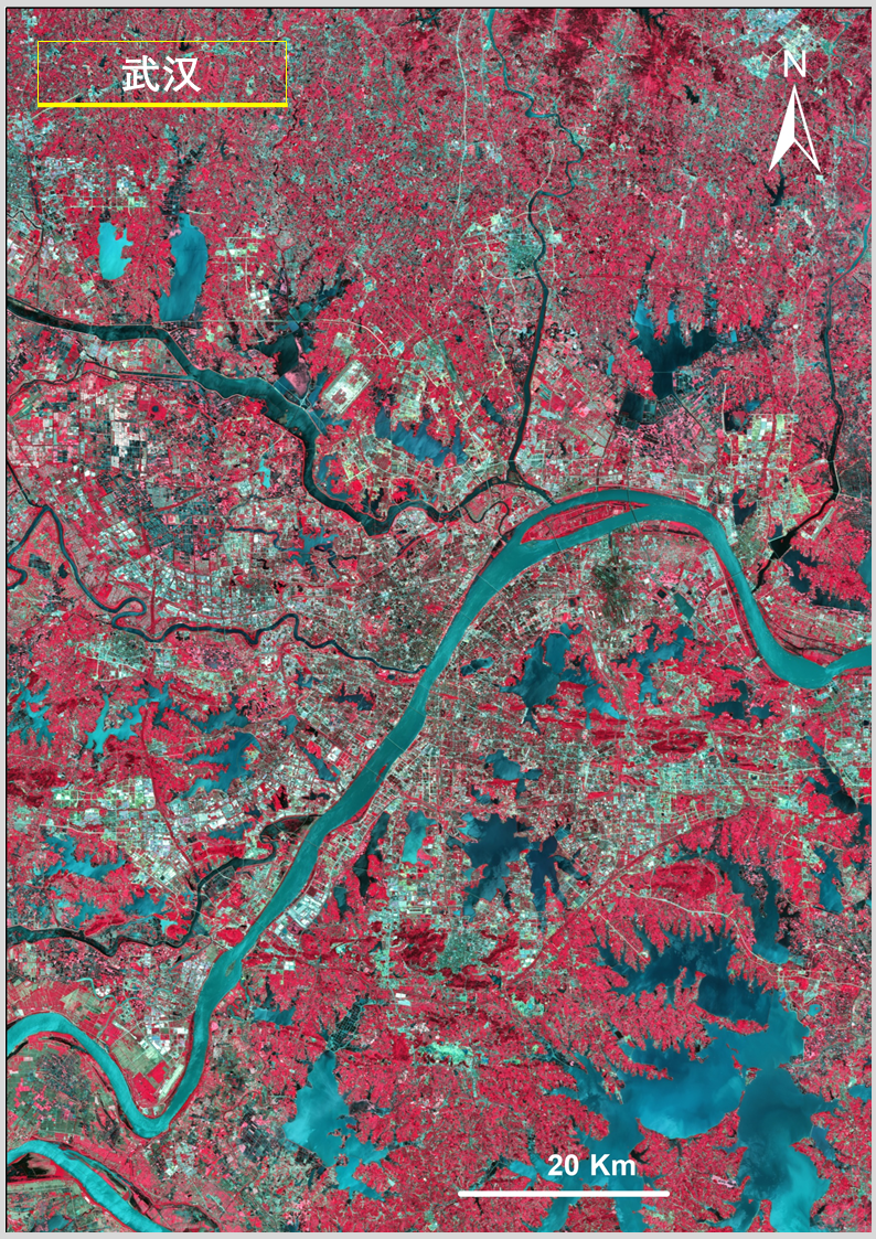 答:上述圖像利用高分一號衞星寬幅相機(WFV)獲取的數據製作,WFV具有藍、綠、紅、近紅外4個波段。水體在近紅外波段反射很弱,而植被在這個波段有強反射,將近紅外、紅、綠三個波段組合成外紅外影像,可以更清晰凸顯水體輪廓信息,便於觀察水體分佈情況。