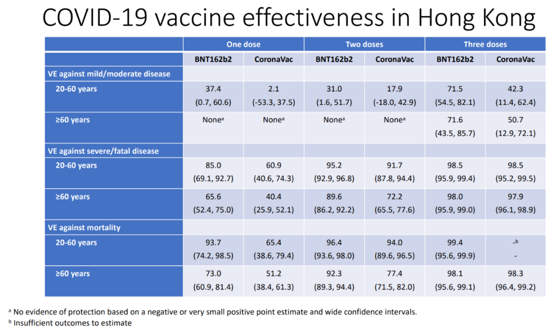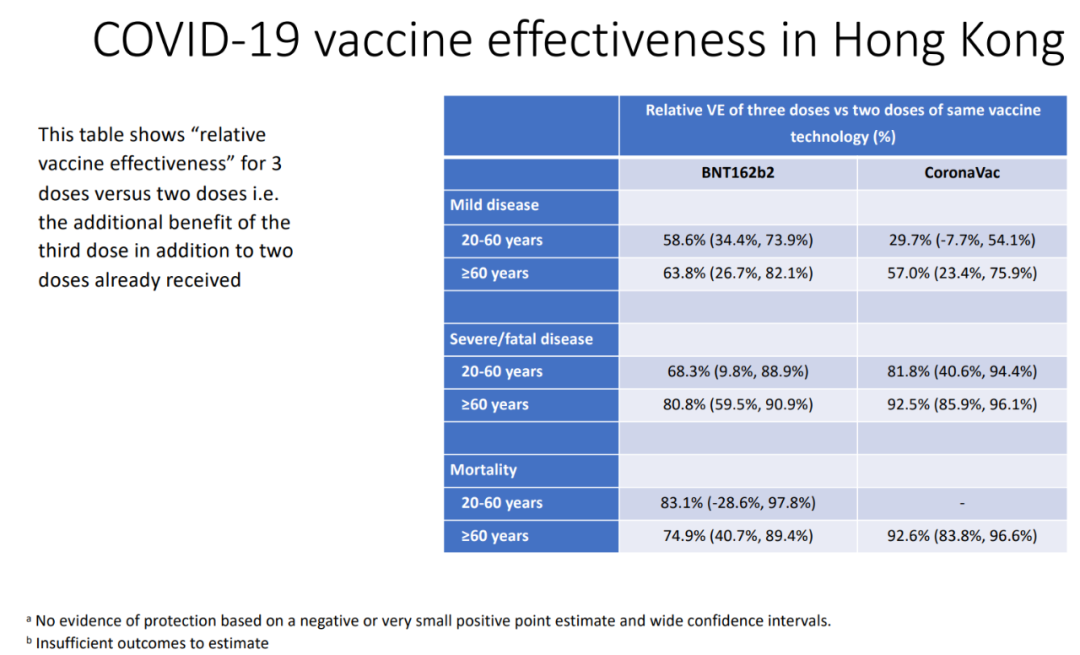 以滅活疫苗接種3劑:2劑為例,在20-60歲人羣中,防重症的保護力會提高81.8%。對60歲以上人羣而言,防重症/死亡的效力增加92.5%和92.6%。