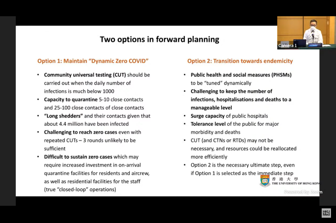 他表示,特區政府和社會應在4月下旬前,在“前瞻性規劃”列出的2個選項中做出選擇,是繼續“動態清零”還是“走向風土病(地方性流行病)”。