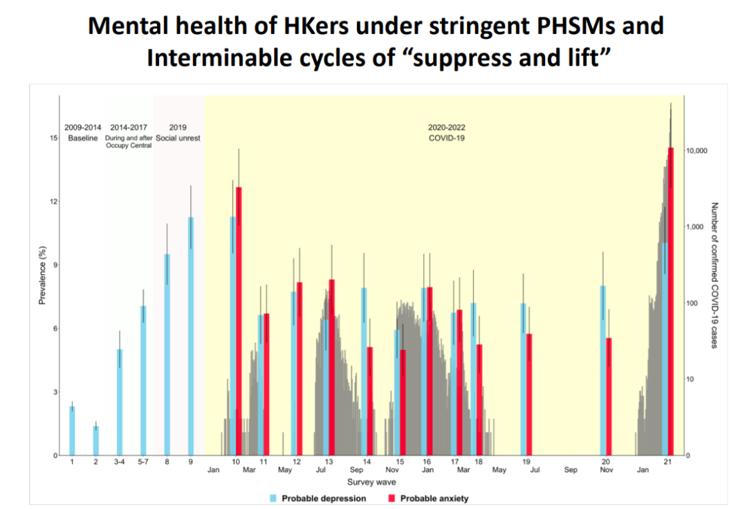 圖片説明:疫情之下,香港特區民眾出現抗疫疲勞、抑鬱、焦慮等情況。2022年1月,特區民眾抑鬱率達到1/10。焦慮症狀比率達13%至14%。/HKUMed
