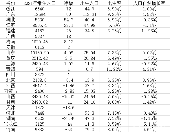 在23個發佈數據的省份中,有18個省份公佈了2021年的出生人口數據。這18個省份中,有一半省份人口自然增長率為負,包括江蘇、湖北、湖南、內蒙古和山西均是近幾十年來人口自然增長率首次轉負。