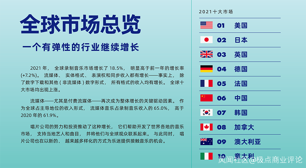 根據IFPI國際唱片業協會剛剛發佈的《2022全球音樂報告》,中國音樂市場在全球的排名再次提升一位,超過韓國成為世界第六,30.4%的增速更是全球區域市場中增長最快的。如果把數據拆解深入分析,很明顯可以看出,這主要是由以騰訊音樂為代表的數字音樂平台所帶動。