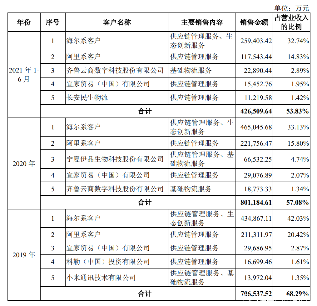財報顯示,2019-2021年上半年,海爾系、阿里系客户合計給日日順帶來的收入佔比分別達到62.5%、48.9%、47.6%。