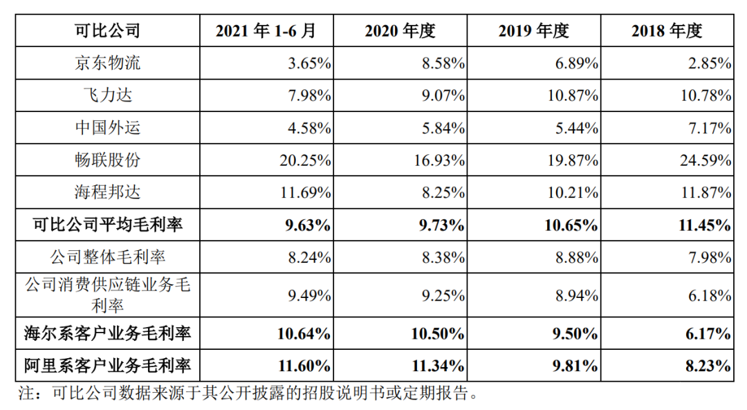 不能否認,輕資產模式給日日順的物流業務帶來了流動性,但是,依賴第三方運力使得日日順的運營成本居高不下。與同行相比,日日順的毛利率也顯著較低。