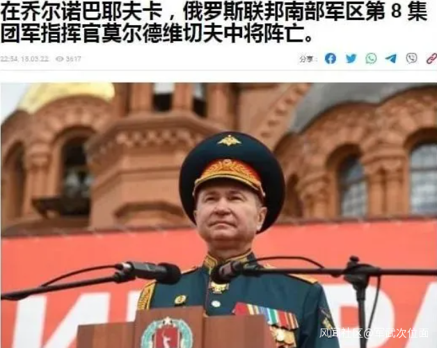 隨後的8天裏,俄41集團軍參謀長格拉西莫夫及29軍團司令卡列斯尼科夫少將也分別在哈爾科夫和基輔相繼陣亡。更可怕的是,烏軍從土耳其等國購入的無人機也成為專盯俄軍將領的空中幽靈,150摩步師師長米傑耶夫少將以及近衞第8合成集團軍司令莫爾德維切夫中將都是在視察前線時被對方無人機鎖定並招致烏軍炮擊而陣亡的。